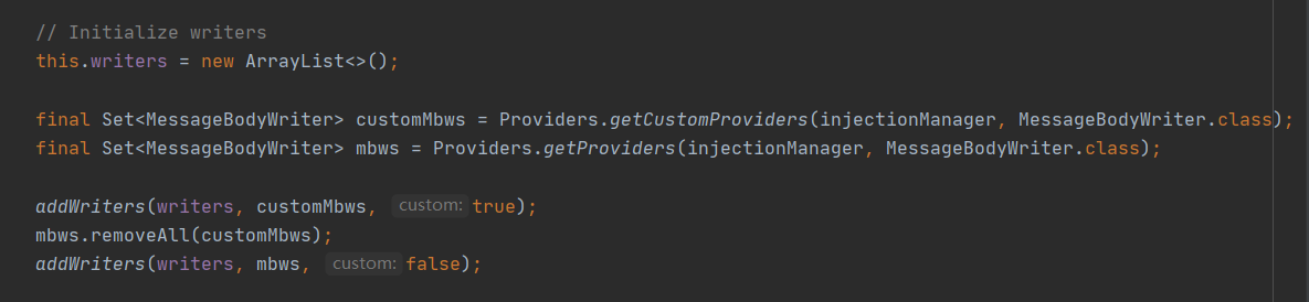 这里的 customMbws size = 2,分别是FastJson和Jackson的实现。但是FastJson在前,而每次需要做JSON序列化的时候,会遍历writers,如果找到支持application/json的MessageBodyWriter则直接返回,所以每次使用的都是FastJson的实现。