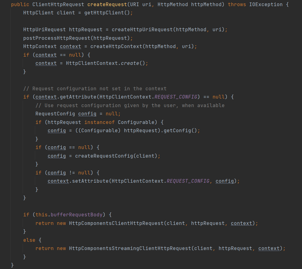 默认情况下 createHttpContext 返回 null,然后会尝试从 HttpUriRequest 和 HttpClient 中获取 RequestConfig 赋值到 HttpContext 中。
