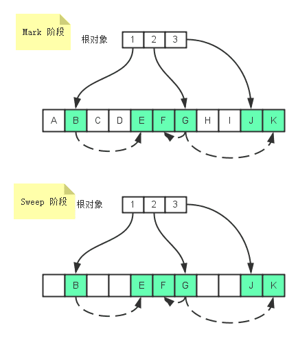 如下图所示,该算法分为『标记』和『清除』两个阶段