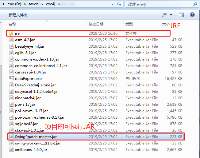 - 新建一个文件夹,将你的 JRE(与JDK同级别的那个JRE),可执行jar 都复制过来,下图除红圈以外的Jar 为项目的依赖Jar 包