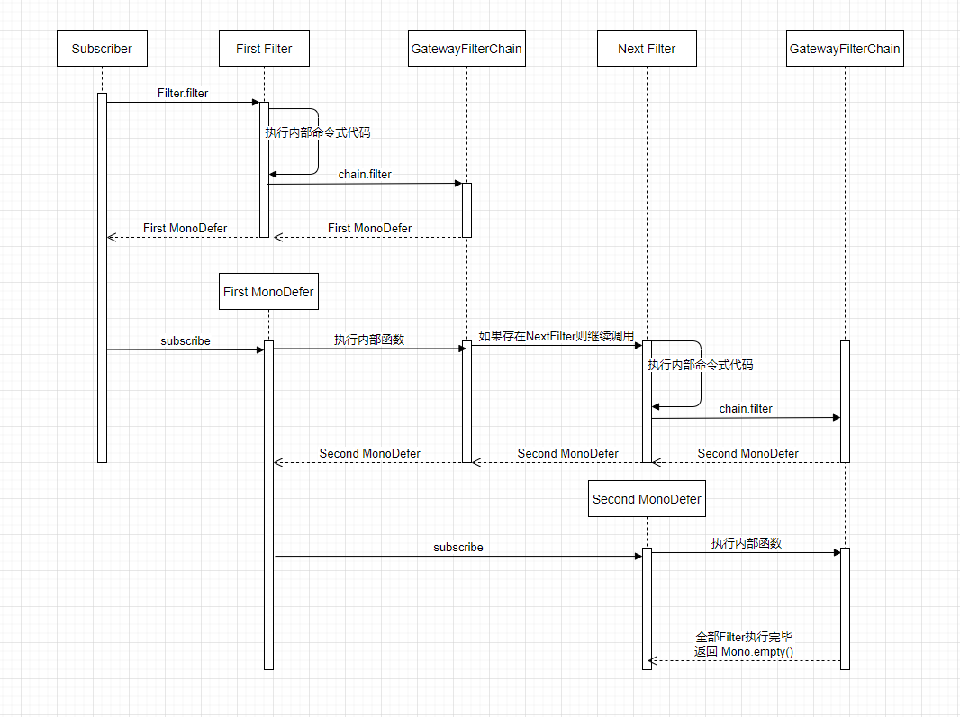 nextFilter.filter,如果所有过滤器都已执行完毕则返回 Mono.empty(对应 MonoDefer 的 44 行)nextFilter.filter先执行filter方法中所有的命令式的代码,然后返回chain.filterFirst Filter 返回的 MonoDefer 内部会去订阅