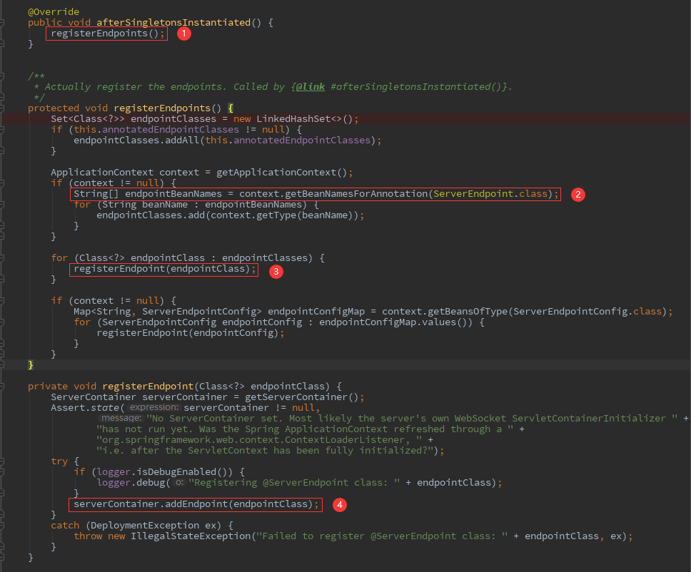 ServerEndpointExporter 实现了 SmartInitializingSingleton,会在bean 实例化结束后调用