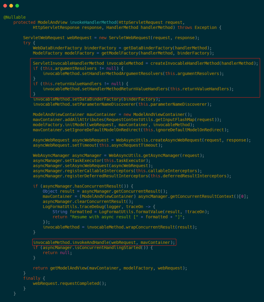 RequestMappingHandlerAdapter 的 invokeHandlerMethod 中 构建了 invocableMethod 对象并将所有的解析器和处理器封装到该对象,通过invocableMethod.invokeAndHandle() 进行对请求的解析,对controller的调用,以及响应的处理