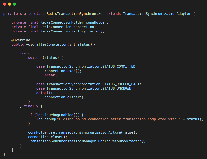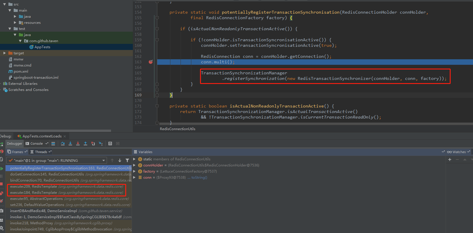 我们RedisTemplate开启事务后,会执行到上图的debug处,RedisConnection 开启事务,并将当前Connection注册到TransactionSynchronizationManager 中,这样在triggerAfterCompletion 就可以同步的管理我们Redis的事务了